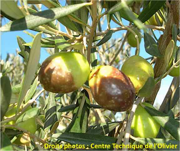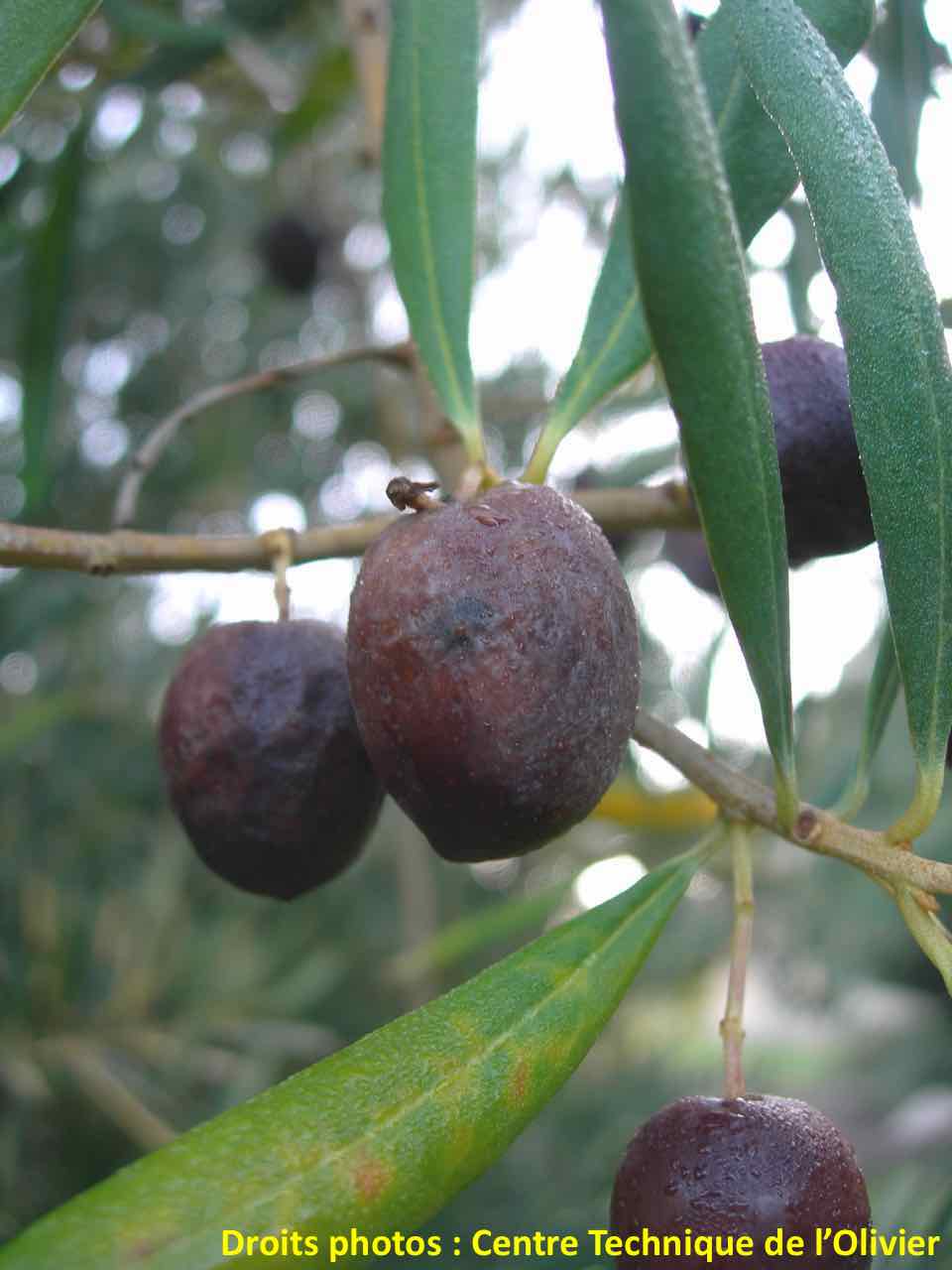 - Le brunissement entraîne des pertes significatives de production pouvant atteindre plus de la moitié de la récolte, notamment sur de jeunes arbres vigoureux peu chargés en fruits. Les olives de gros calibres sont davantage sensibles au brunissement. Les dégâts sont également plus prononcés au cours des automnes doux et humides, plus favorables au développement des champignons.